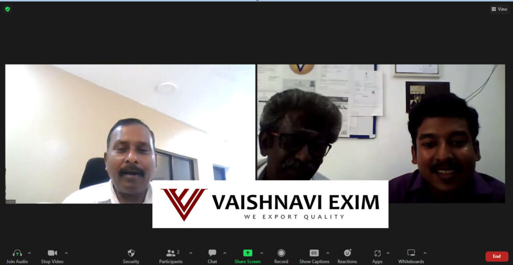 Our Recognitions We are VAISHNAVI EXIM, an 100% Export Oriented Unit based in Madurai, Tamil Nadu, INDIA VAISHNAVI EXIM - Excellence Award 2024 Award from State Goverment Speech by Managing Director Managing Director Addressing the Audience Mr. Navin - Sales Director - Excellence Award Participated in Agri Tech Expo 2022 Consignment Mr. R S Senthil Kumar Managing Director Testimonials Testimonials What Our Client Say Really I am happy working with your Company. Looking for long term business. Thank you – Our Client We are Certified by: